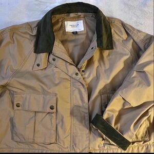 Like new! Excellent pre-owned condition SUPER CUTE tan khaki camel cotton jacket or coat with dark green corduroy collar & cotton lining by American Eagle or AE. Size women’s XXL.