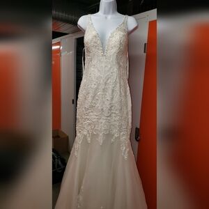 Ivory Wedding dress with tag appears to have never been worn. Stored in zipped garment bag will need to be sent out and cleaned. Excellent structural condition. Professionally measured bust 34 waist 28-30 hip 36 back 76 front 62