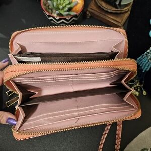 Snake Print Wallet (Pink color), double top zipper closures. Hand wrist strap. 8 credit cards slots. Lots of compartments inside. Like new. No rips or stains. Like New.