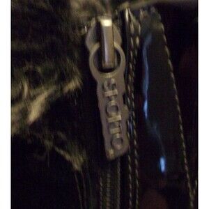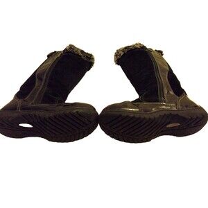 Black. Leather --with some man-made upper material--faux fur and patent.. The leather feels like suede. Side full zipper for easy on and off.. The other side has a woven through grommets accent-see last picture--that is approx. 1/3 of the shaft Rubber sole--skid-resistant.