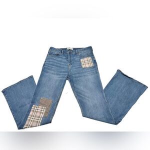 Abercrombie Kids high-rise flare jeans featuring plaid patchwork accents for a trendy Y2K look. Medium wash denim with light fading and whiskering, classic five-pocket design, and zip fly with button closure.