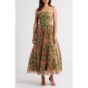 Women's Hutch Strapless Pleated Floral Midi Dress in Green & Pink, Size 2