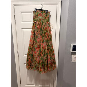 This is a new with tags Hutch strapless midi dress, size 2, featuring a vibrant green and pink floral print. The dress has a fitted bodice and a pleated skirt that falls to a midi length. A thin gold-colored cord is cinched at the waist, with decorative ties on the sides. The interior lining is a solid green. The dress appears to be made from a lightweight, sheer fabric over a solid lining.
