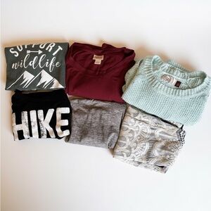 Instant wardrobe refresh! This 6-piece blended clothing bundle for women features a mix of casual, active, and bohemian styles. All items are Size Small. Great variety for layering across seasons, from hiking and workouts to cozy casual wear.