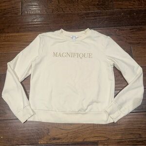 Chic pullover with black snap accents. Soft cream fabric for comfort.