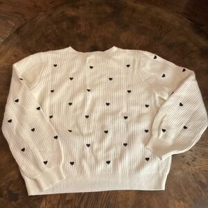 Chic cream sweater adorned with playful black hearts. Ideal for casual elegance. Ptp 22.5”