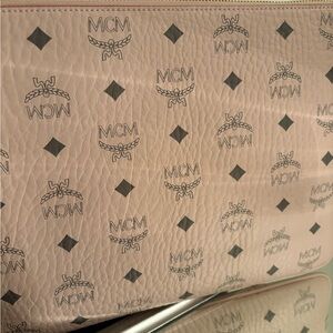 Elegant MCM crossbody bag in pale pink. Features signature logo pattern. Perfect for adding luxury to your look. New beautiful with iconic MCM designer style.