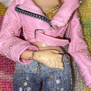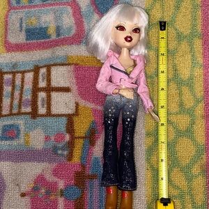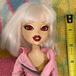 Doll with striking white hair and a pink jacket. Features bold red eyes and detailed makeup.
