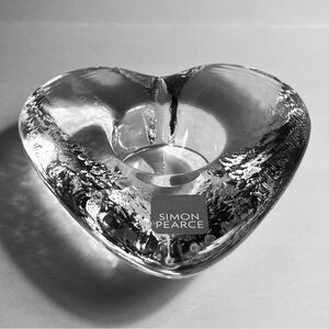 This is the Large Highgate Heart Votive and is no longer available on the Simon Pearce website. It measures approximately 5 inches long by 4 3/4 inches wide by 1 3/4 inches thick. It is in excellent condition with no chips or cracks. The original Simon Pearce label is still attached (see photo) and the Simon Pearce logo is acid-etched on the side just below the rim (see photo).