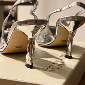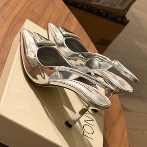 Chic and modern metallic silver heels. Sleek design with a pointed toe. Ideal for elevating any outfit.