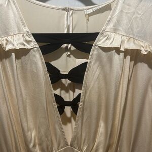 NWT DOEN Lorelei dress in mother of pearl cream color. Back tie. V neck with black tie detail in front. Ruffle hem, collar, and wrists. No callouts. Stock photo added for reference.