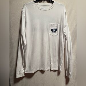 Classic white long sleeve tee. Features blue Shark Week logo on the pocket. Ideal for casual wear.