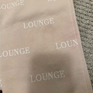 Cozy beige lounge set featuring a repeated 'LOUNGE' logo print. Includes a sweatshirt and matching pants. Quality material and the softest fleece,has some stains from being with other clothes in the box,never worn,no tags