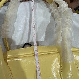 Hello Kitty bowler handbag in pastel yellow. Soft buttery bowler with iconic Hello Kitty logo includes crossbody straps and a strap holder button to keep straps together while in crossbody mode. . Stylish bag adds kawaii charm to any outfit
