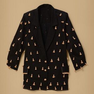 Elevate your style with our Black Raffia Fringed Blazer. Featuring center front buttons, crochet button detail, and patch pockets, this blazer creates a playful yet sophisticated look. Complete with a collar neckline and long sleeves, it's the perfect addition to any outerwear collection.