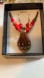 The Mix It necklace showcases a stunning teardrop-shaped pendant in a rich brown hue, intricately designed with openwork patterns. Vibrant red beads are interspersed along the multi-strand chain, adding a striking contrast to the piece. This elegant necklace is perfect for making a bold statement.