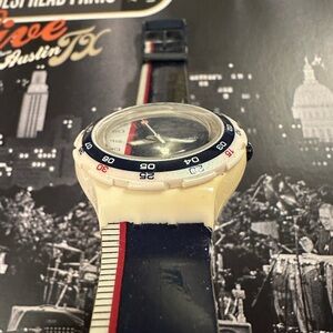 Elegant Swatch watch with a blue strap and silver case. Ideal for versatile wear. 200 meter water resistance. Works perfectly with new battery. Swiss quartz movement.