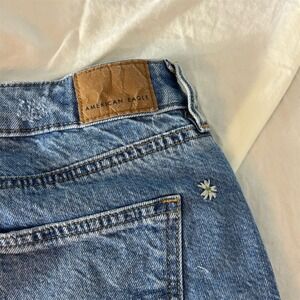 Keywords: American Eagle, Mom jeans, floral pattern, high-rise, distressed, summer fashion, casual wear, blue jeans, recycled cotton, size 4, women's jeans, medium wash, machine washable, pre-owned.
