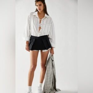 Stylish white button-up shirt with black stripes. Paired with a chic black skirt.
