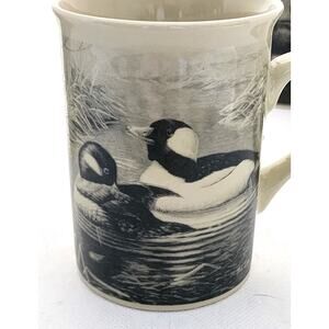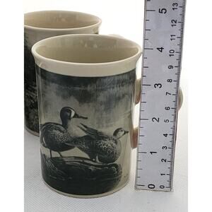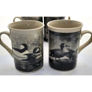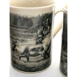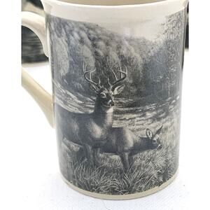 Set of 4 mugs. These are from Field & Stream collection. The cups are a beige color. Each one has a different unique drawing. Deer, elk, mallard, wood duck. They are done in design that looks like old photographs. I believe they are drawings and not photos. Each mug has the same picture on both sides. The mug holds 8 oz (1 cup). The deer cup has a small chip at the bottom rim. SEE LAST 2 PICTURES.