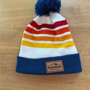 Keep your child warm and stylish with the Kids' Striped Beanie. Featuring vibrant red, orange, and yellow stripes, this beanie is perfect for any winter adventure. The blue pom-pom adds a fun touch to this cozy accessory.