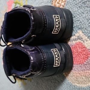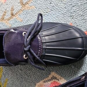 Stylish navy blue duck boots with lace-up design. Perfect for rainy days.