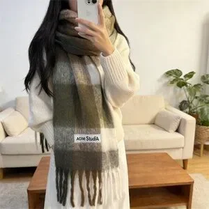 Stylish Acne Studio scarf in olive and beige. Soft and cozy for any occasion.