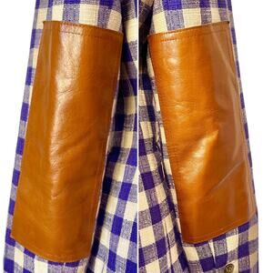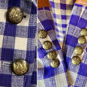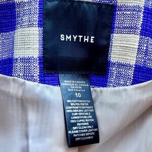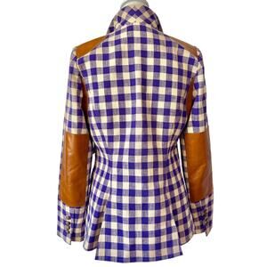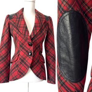Keywords: Smythe power blazer, leather patch blazer, equestrian blazer, plaid blazer women, Canadian designer blazer, tailored womens outerwear, structured blazer women, luxury pre-owned fashion