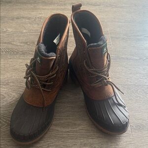 Stylish brown and black duck boots with lace-up design. Perfect for outdoor adventures.