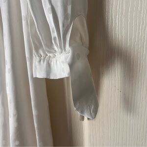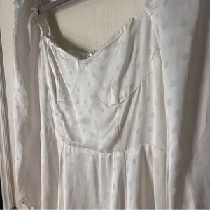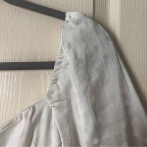 This silky drop empire waist mini dress is a stunner. A Beautiful white with white dots. Alittle bit of “puff” to the shoulders and a flowy bottom.