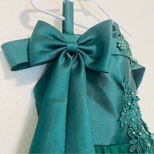 This elegant green kids dress features a beautiful bow and floral lace detailing, perfect for special occasions.