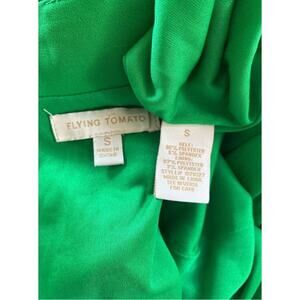 Flying Tomato retro style mini sheath dress with mock turtleneck, belt with rhinestone and gold accented buckle that snaps at the buckle (belt is removable and can be replaced by your belt of choice), peasant balloon sleeves and full back zipper in a beautiful vibrant kelly green.