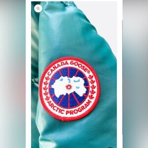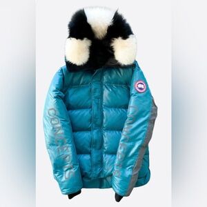 Stylish teal puffer with gray accents. Warm and cozy for winter days. Features iconic Canada Goose logo. Teal color. Two front pockets. Zipper closure is concealed. This is in collaboration with Concepts and is a rare find.