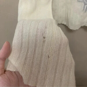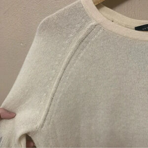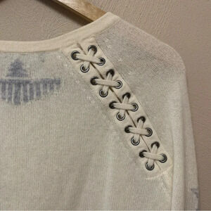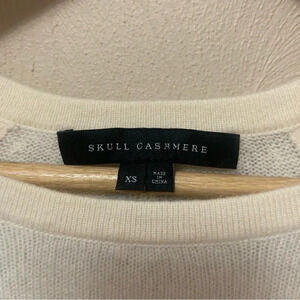 Skull Cashmere Lincoln Sweater Size XS Color: Chalk (cream) and heather grey (gray) The Lincoln sweater from Skull Cashmere is designed in a chalk cream light cashmere knit. Features: * Round neckline * Long raglan straight sleeves with back lace up detailing along the seams and ribbed cuffs * Heather grey skill and tribal motif intarsia design * Loose fit with ribbed hem * 100% cashmere **Please see last photo. Two small holes in the cuff of one arm.**