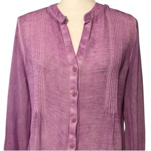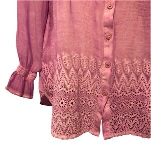 Excellent condition no flaws. Details: v neck, lace, button up closure, lace detailing, acid wash, long sleeve with elastic ruffed cuff, no cami, tunic length. Laying flat: pit 19 inches; pit to cuff 19 inches; length 28.5 inches; shoulder 16.5 inches. Material: rayon.