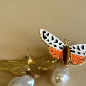 These elegant butterfly drop earrings feature a striking combination of black, orange, and white colors. Perfect for adding a touch of sophistication to any outfit.