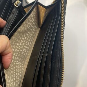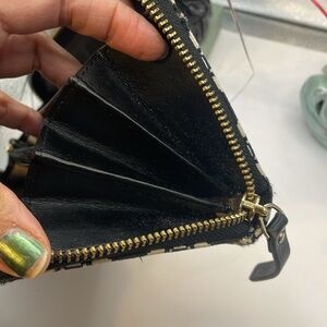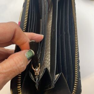 Stylish wallet by Kate Spade. Features a black and cream pattern. Pink stripe adds a pop of color.