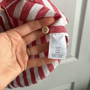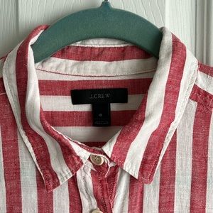 Stylish button-down shirt. Red and white stripes. Long sleeves. Front pockets.