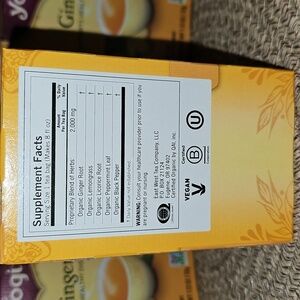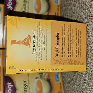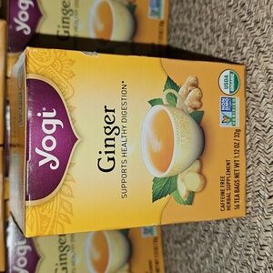 6 New Boxes of Yogi Ginger Tea. Supports healthy digestion. Caffeine free. Yogi Ginger Tea is a popular organic, caffeine-free herbal tea known for its spicy, warming blend of ginger, lemongrass, peppermint, and black pepper, traditionally used to support healthy digestion and promote balance, offering a naturally delicious way to warm up or soothe your stomach. It's USDA certified organic, vegan, and comes in compostable bags, with some users adding honey for extra sweetness, though licorice root in the blend provides natural sweetness.