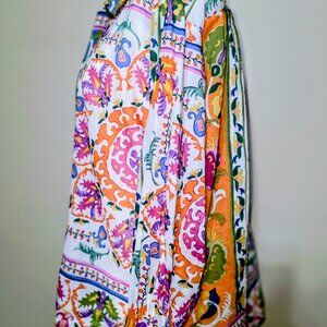 Gorgeous Chelsea & Theodore blouse featuring a vibrant boho scarf-print design in orange, purple, green, blue, and gold tones. Lightweight, airy fabric with a relaxed fit—perfect for adding a bold, stylish touch to any outfit.