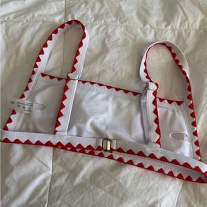 Shein two-piece bikini set in size XS. Features a red, green, and white floral pattern with zigzag trim. Includes a bralette-style top and a triangle-cut bottom. Great for summer, beach days, or poolside lounging. Gently worn and in excellent condition.
