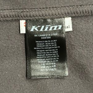 Klim Delta Jacket in Black, has an embroidered flag logo in gray on the sleeve. Size Small. Excellent preowned condition, gently worn, no flaws. Pit to pit measures 20.5”, Length 28”.