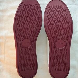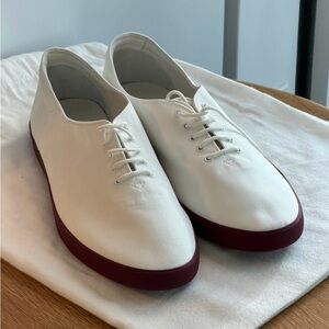 Elegant white sneakers with deep burgundy soles. Ideal for everyday style.