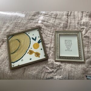 Charming art set from Hobby Lobby. Features a straw hat with yellow and blue accents. Includes a motivational quote in a decorative frame.