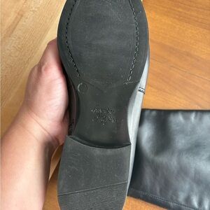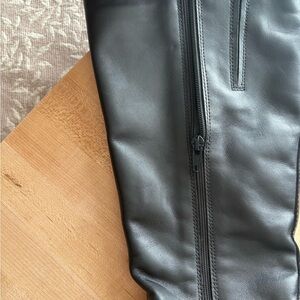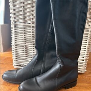 Elegant black leather boots with a sleek design. Perfect for versatile styling. Italian leather. Fits size 9, labeled 10M. Like new condition.
