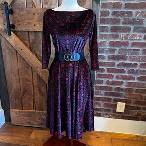 This vintage-inspired fit & flare dress has a flattering silhouette with 3/4 sleeves, a scoop neckline, a dramatic V-back, and a soft, velvet-touch finish with a slight sheen, stretchy fabric that moves beautifully. It also includes belt loops (wear with your favorite belt!) and hidden side pockets — a major bonus!