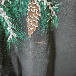 In good condition, mockneck has been removed and there is a stain right below a pinecone on front (see photos), slightly faded from washing