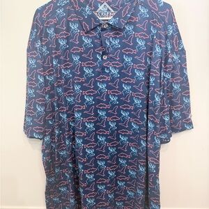 Stylish navy shirt with vibrant red and blue wildlife design. Perfect for casual outings. Features button-down front.