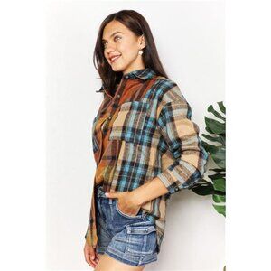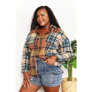 Double Take Plaid Curved Hem Shirt Jacket with Breast Pockets
