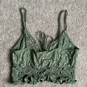 Stylish green crop top with floral pattern. Features a tie front and adjustable straps.